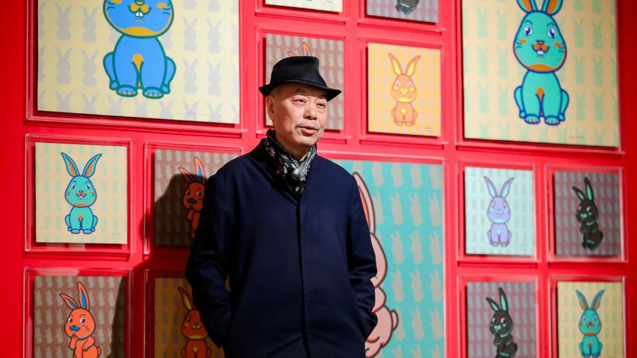 Чэнь Сянбо позирует со своей работой «Круглый кролик».